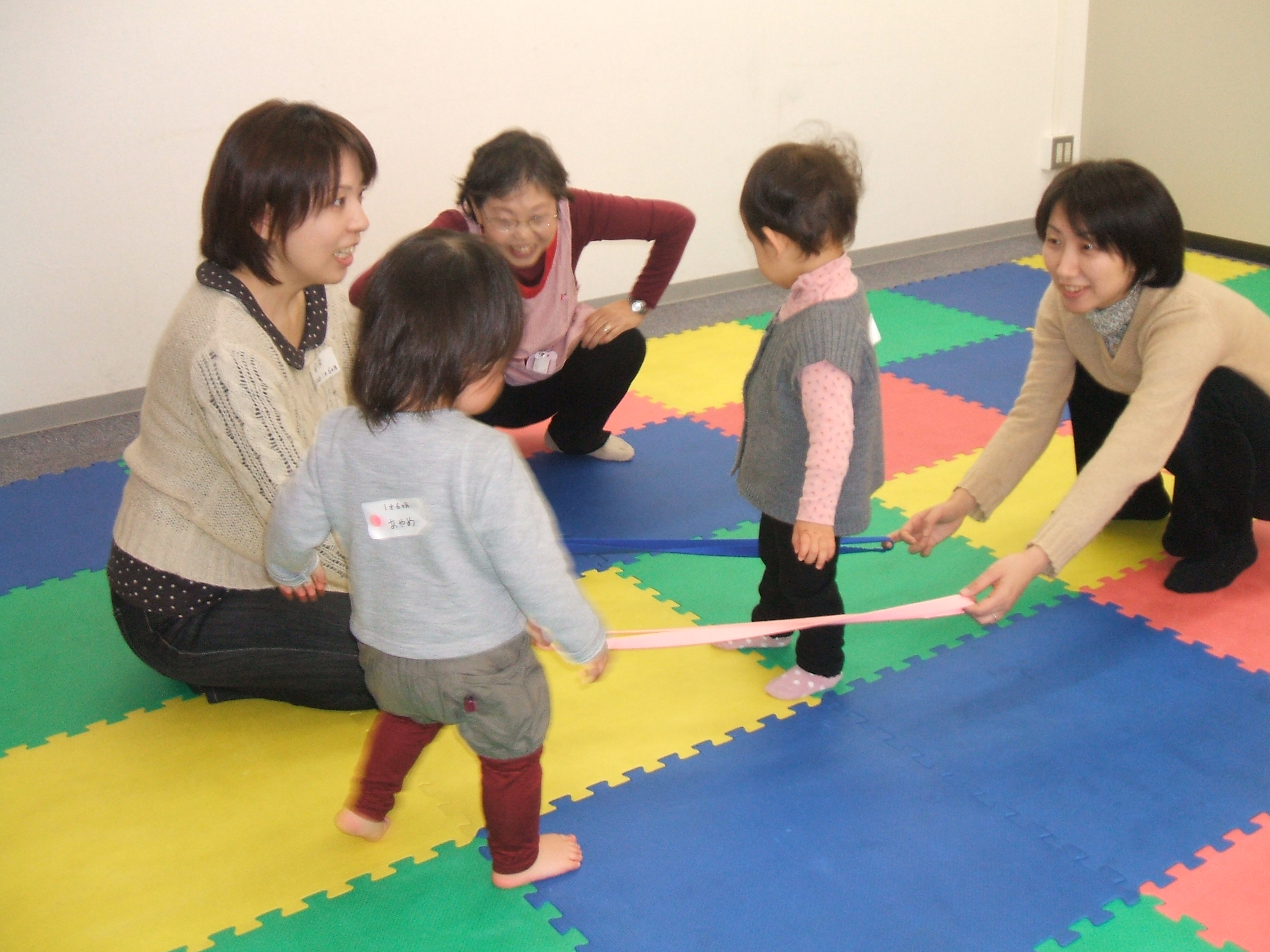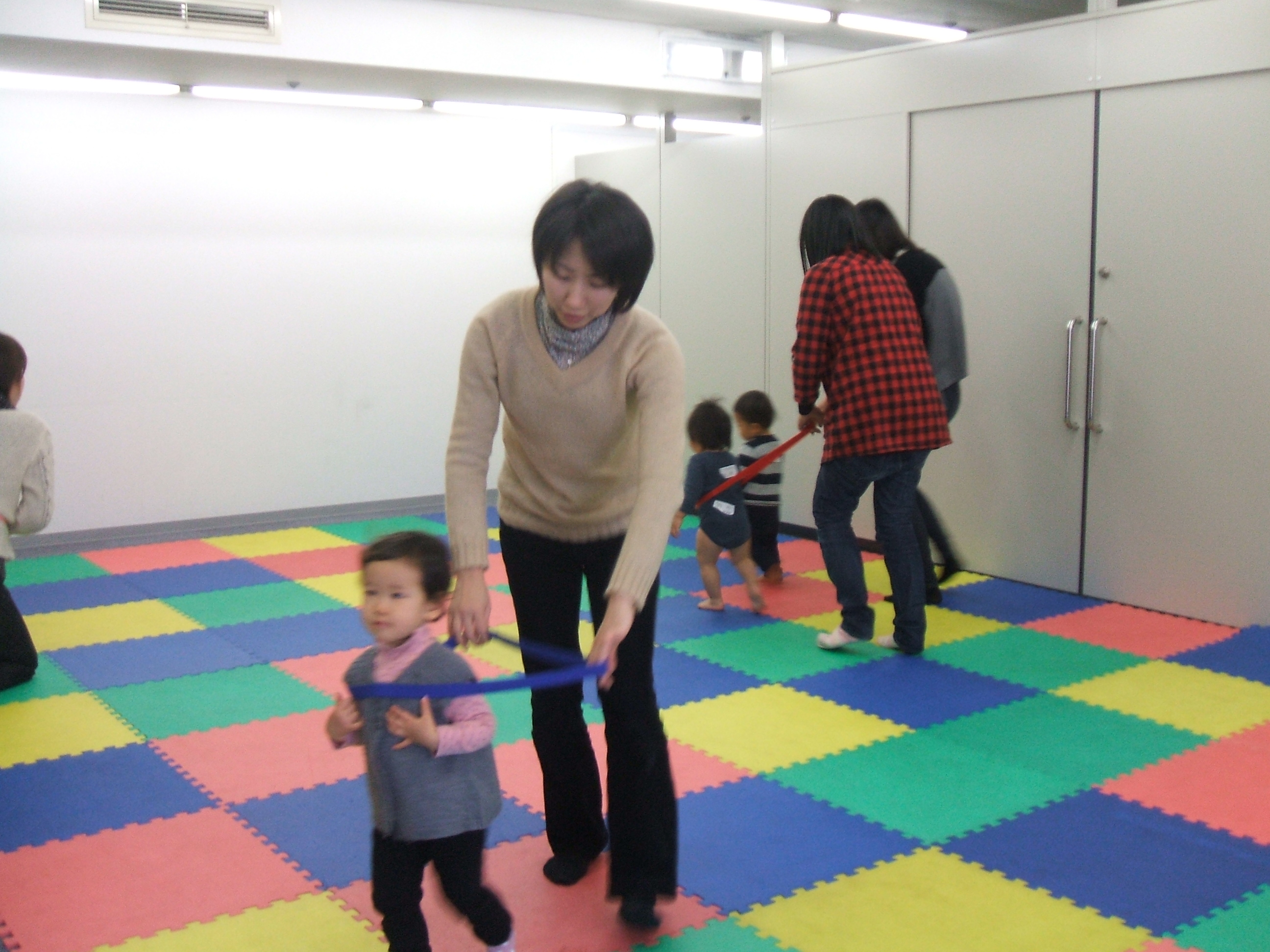 電車ごっこをしたり、ゴムの橋をまたいだり・・・。