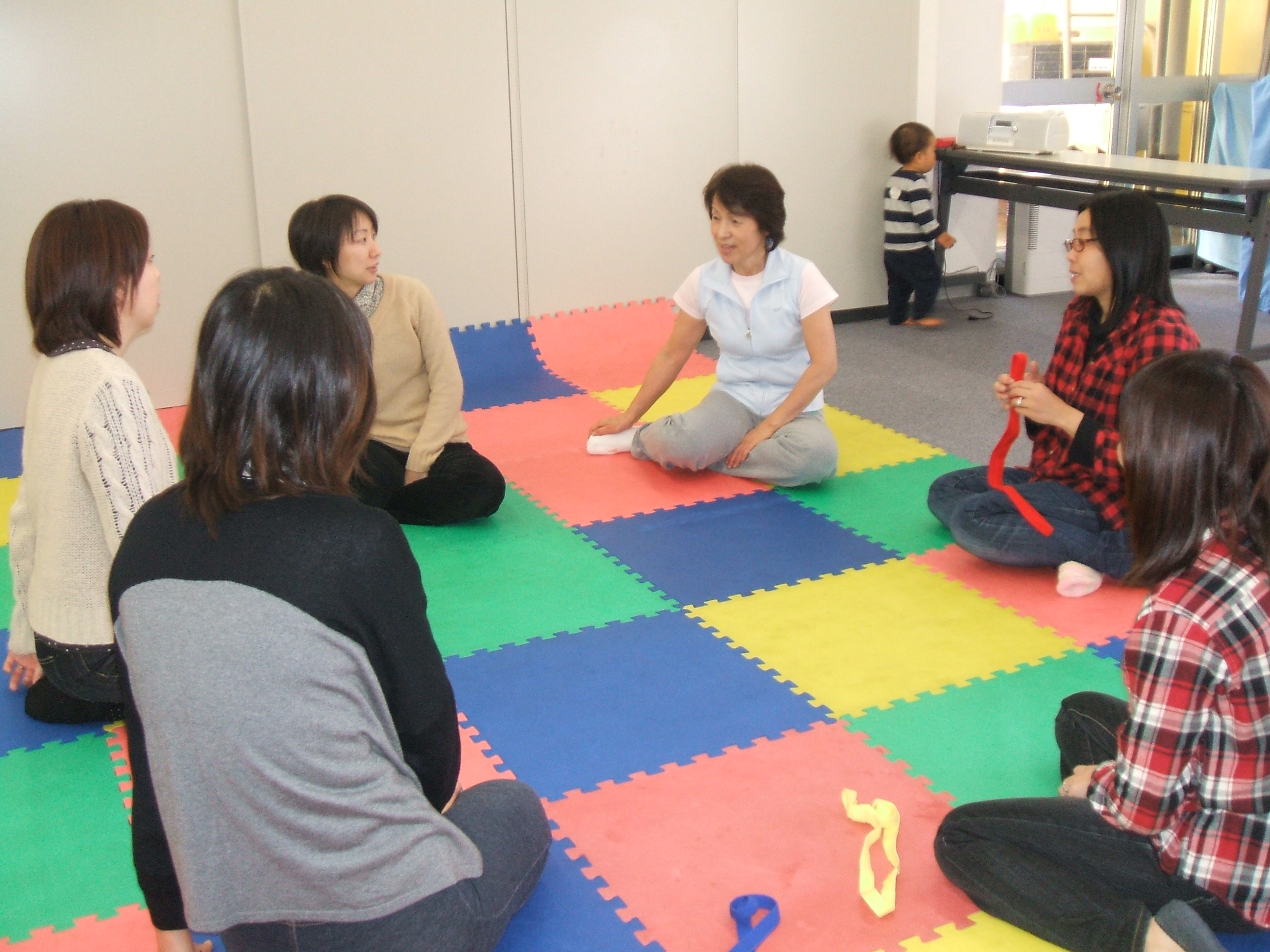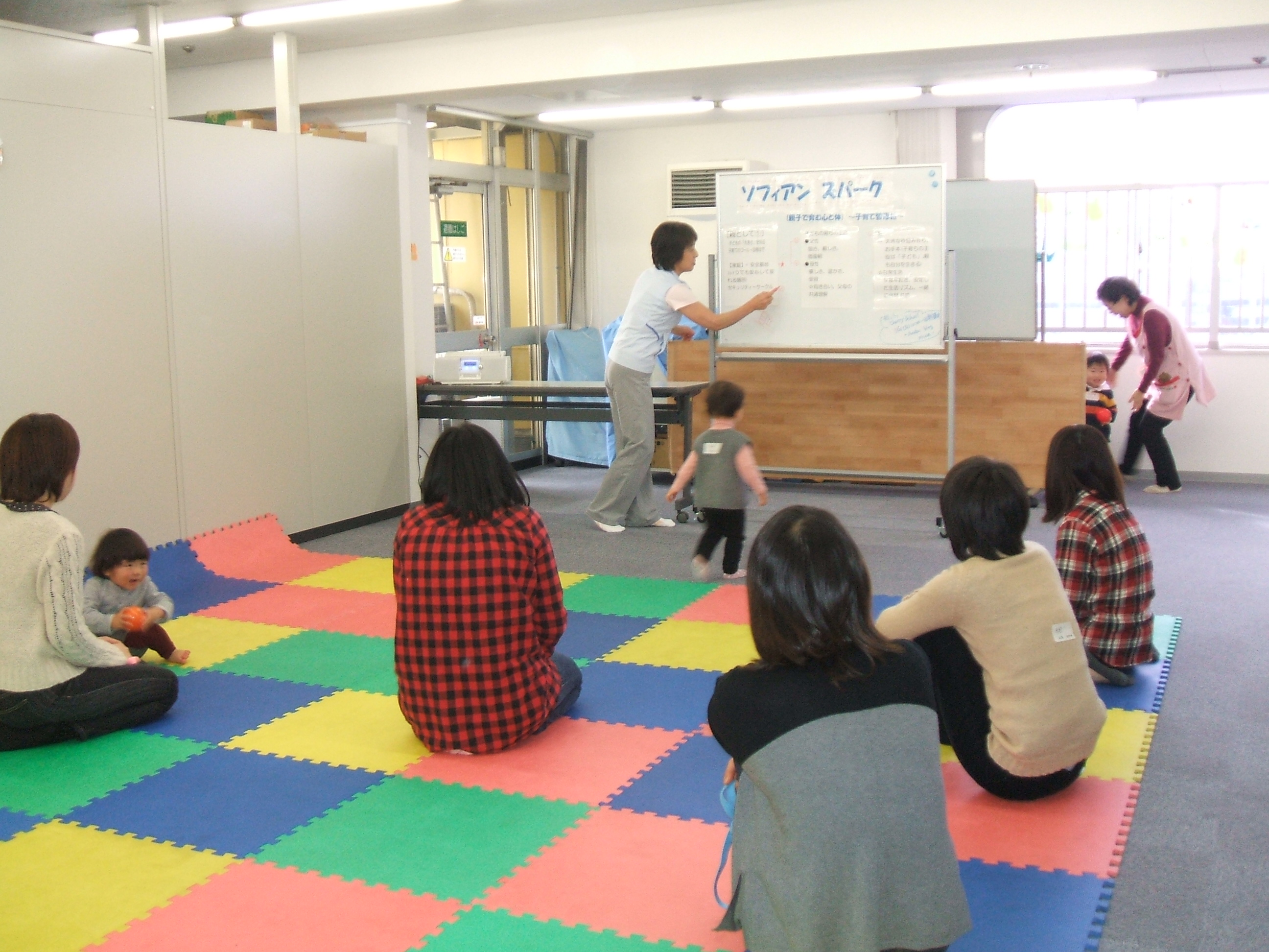 前半は親子体操でスキンシップ、後半は子育てミニ講座になっています。