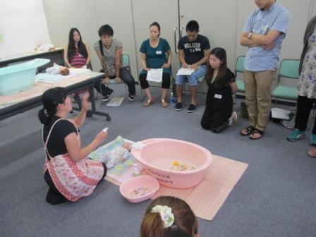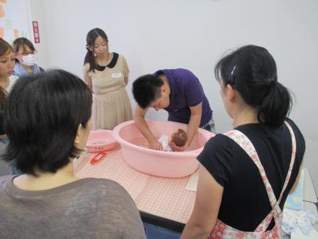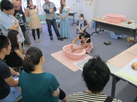 そのあと、みなさんに沐浴人形で実際に赤ちゃんをお風呂に入れる体験をします。