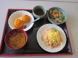 今日のメニューは「彩ちらし」「筑前煮」「茶巾しぼり」、そして、当日急きょ作ってくださったのは「パプリカのお吸い物」でした。