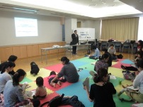 当日は、0~1歳のお子さんを中心に19組の親子が参加し、お母さんたちも資料をみながら熱心に先生のお話を聞いていました。