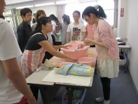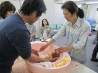 赤ちゃんの人形を使って、お風呂の入れ方を助産師さんに実際にやっていただきます。