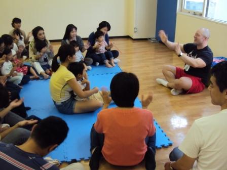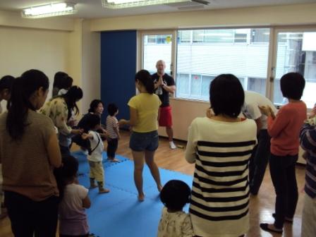 最初はみんなで少し体操。お父さんの足の上にお子さんが立ってバランスをとったり、