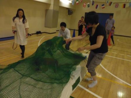 子どもも大人も夢中になってみんなでネットをめがけてボールを投げました。