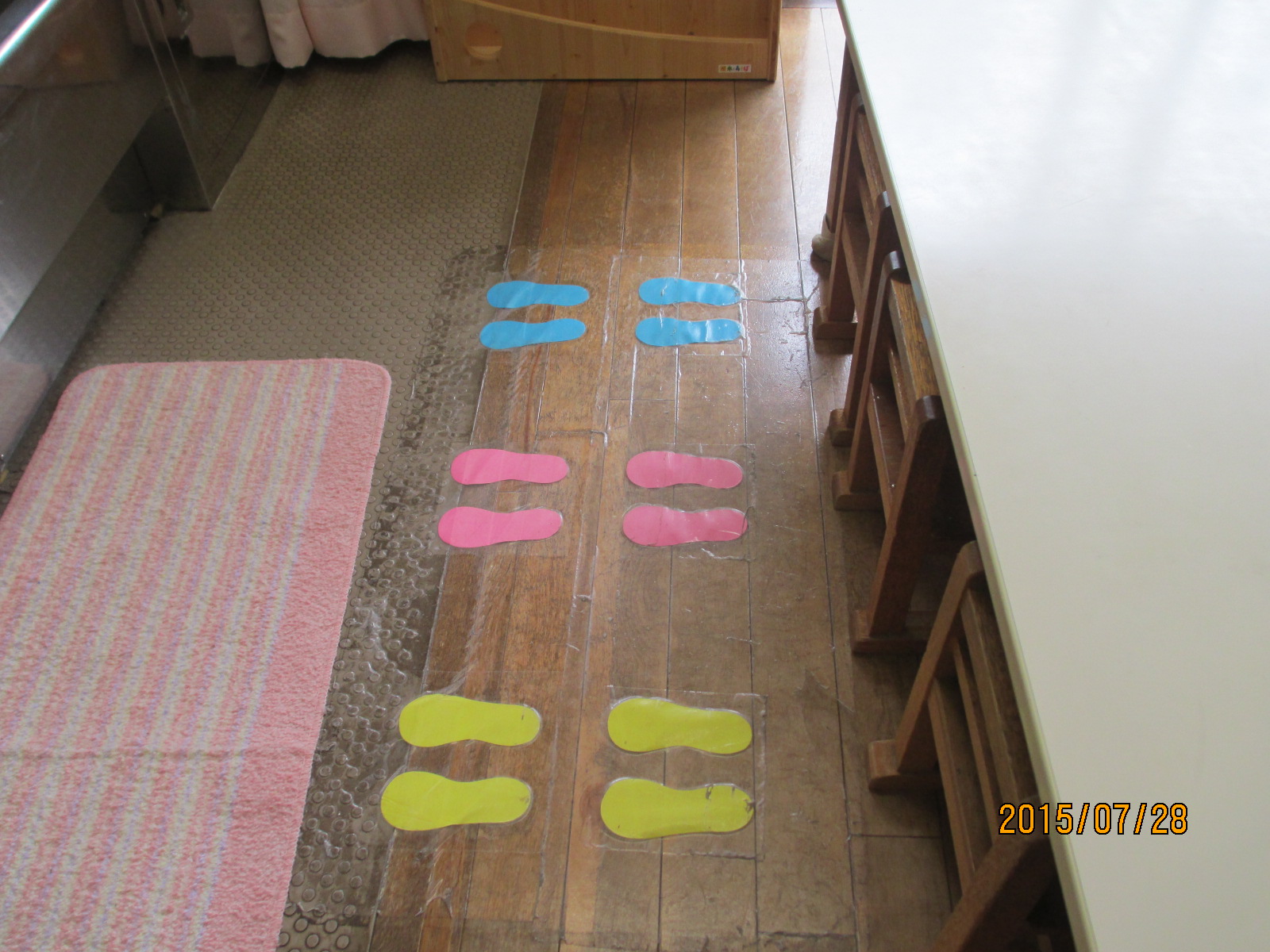 「お友だちが使っている時はこの足跡の上に立って待ちましょうね」の印です。