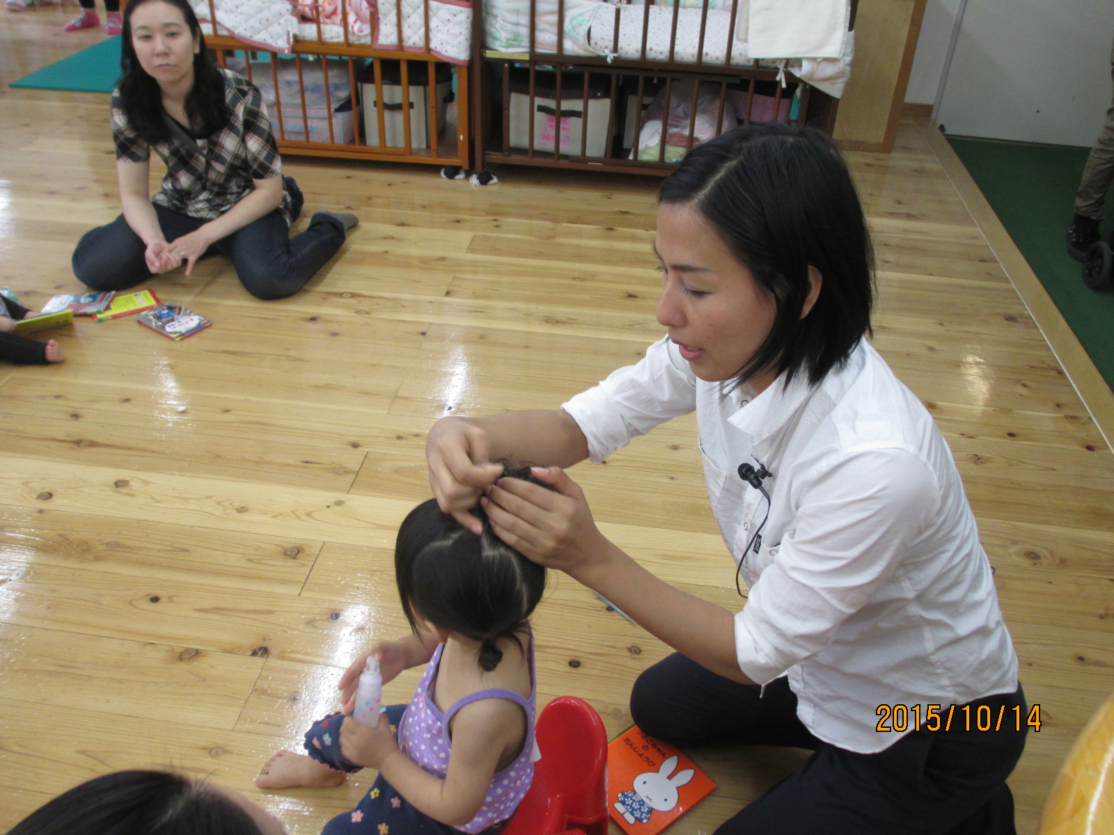 サポーターズは着付け師のママ。わが子をモデルに3才児の着物の着付けとヘアーアレンジのデモンストレーション、そして、希望者には別室で着付け&ヘアーアレンジの体験をしていただきました♪