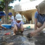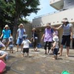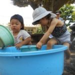 砂地の園庭に水を蒔き、たらいに水を入れて準備OK!