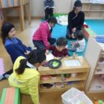 ひろばで交流!ママゴトの「御馳走を食べて!」やママ達も15年後のお子さんを想像して…笑顔です!