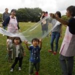 虹色のシャボン玉をうっとり見とれる子、追いかけてパチンと割って楽しむ子・・・