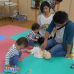 パパも真剣そのもの!! 乳児は2本指で胸の中心を胸骨圧迫(心臓マッサージ)!