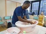 スライドを使用して沐浴の目的や入れ方の説明を受けた後は、いよいよ実技です!