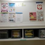 下段の引き出しにイベントチラシが、情オブ掲示板には区内幼稚園の未就園児向けの情報を掲示しています