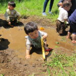 長靴を履いている子や泥遊び用にしている靴を履いている子、裸足で遊んでいる子とみんなそれぞれの感触を楽しんでいました。