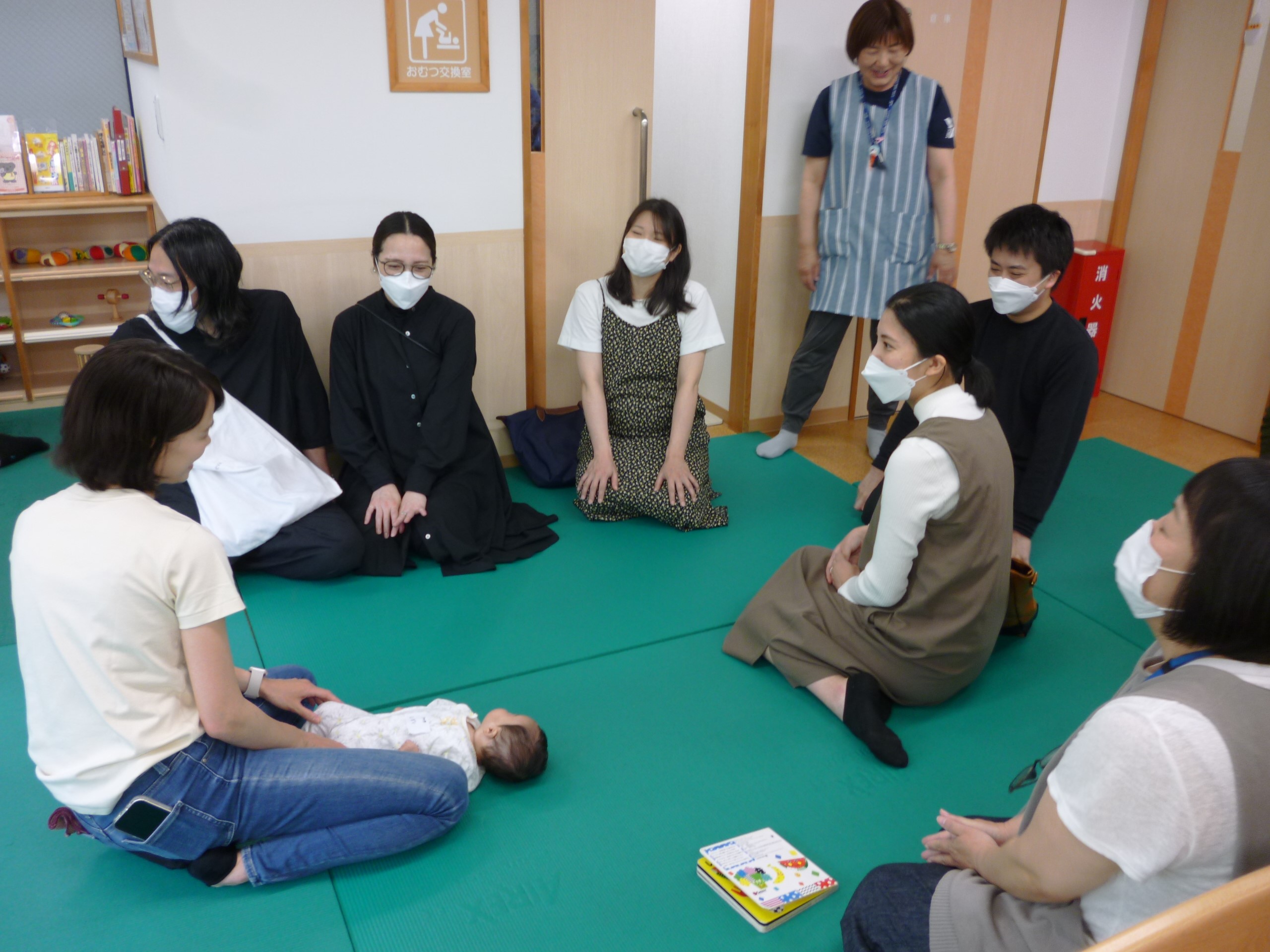 中区役所の別館ではプレマザーズクラス(両親教室)が開催され、終了後にプレママ・プレパパ3組がのんびりんこに見学に来てくれました。