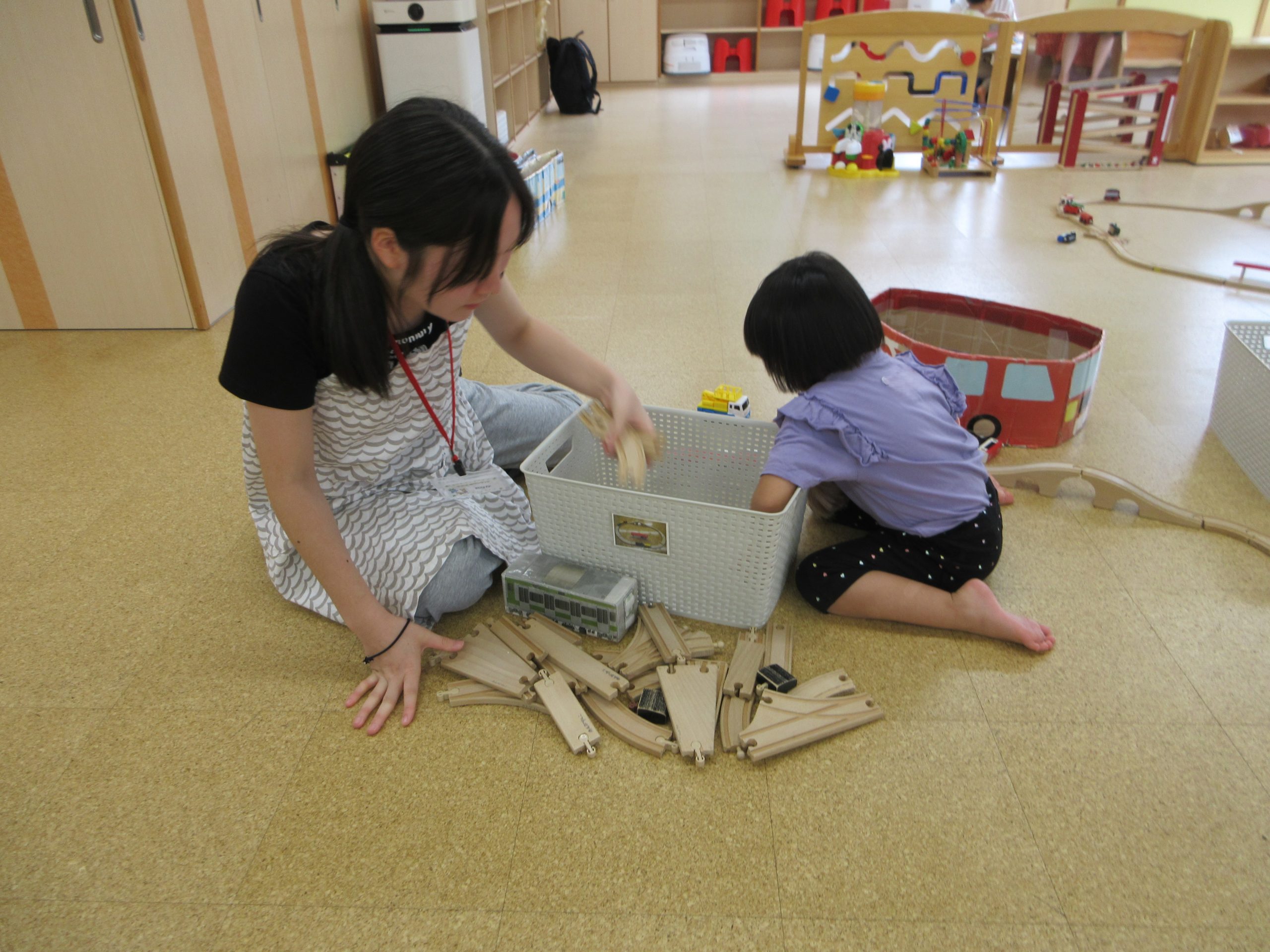 中学生ボランティアのお兄ちゃんと一緒にブロックをたくさん積んで楽しむ