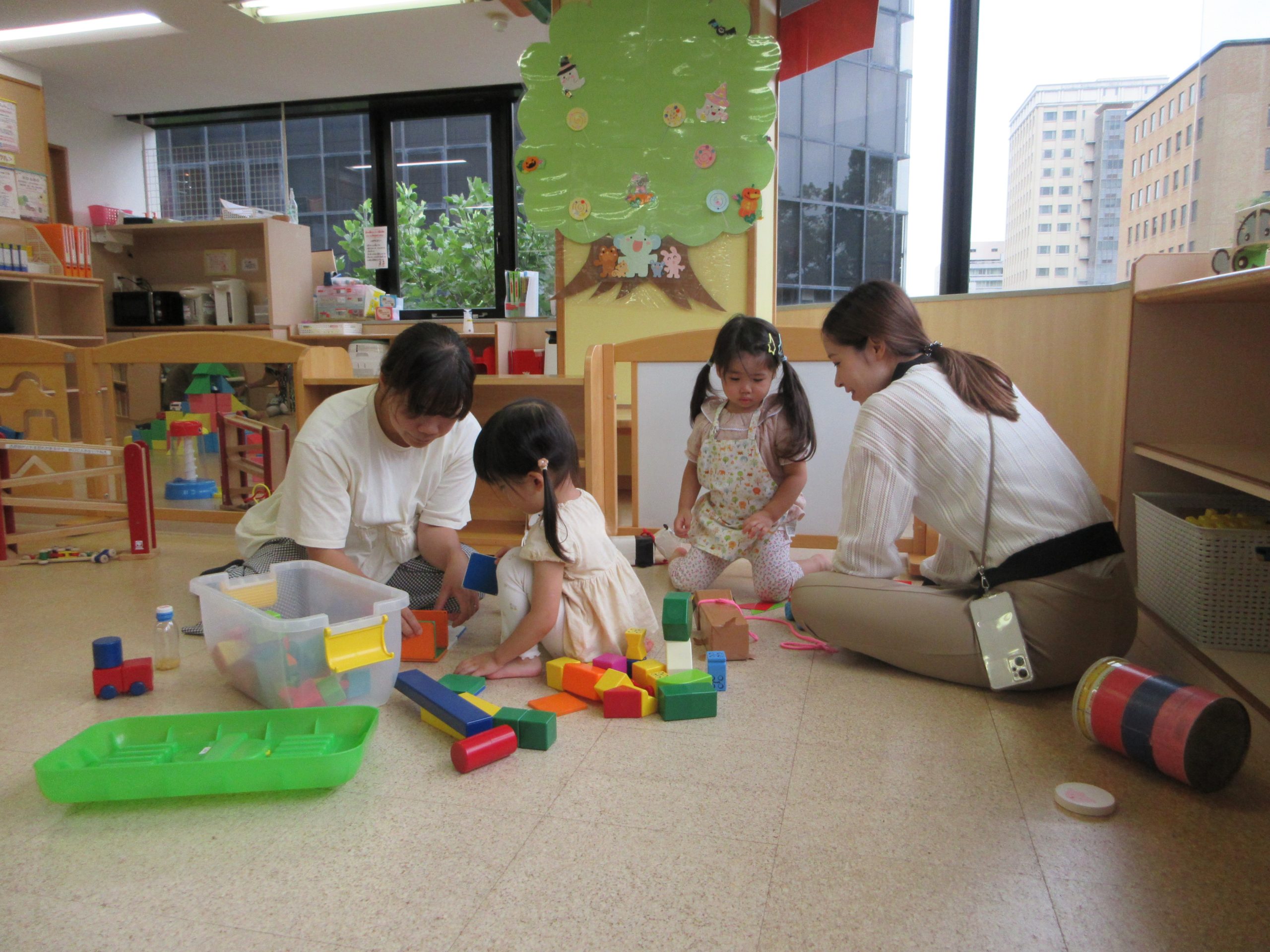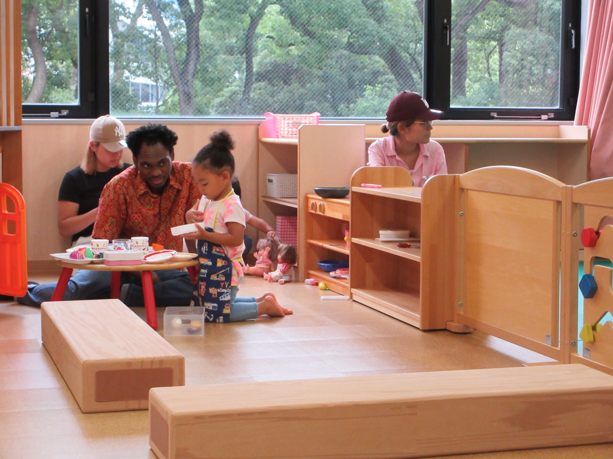 今日はエプロンをつけてキッチンコーナーでお料理したり