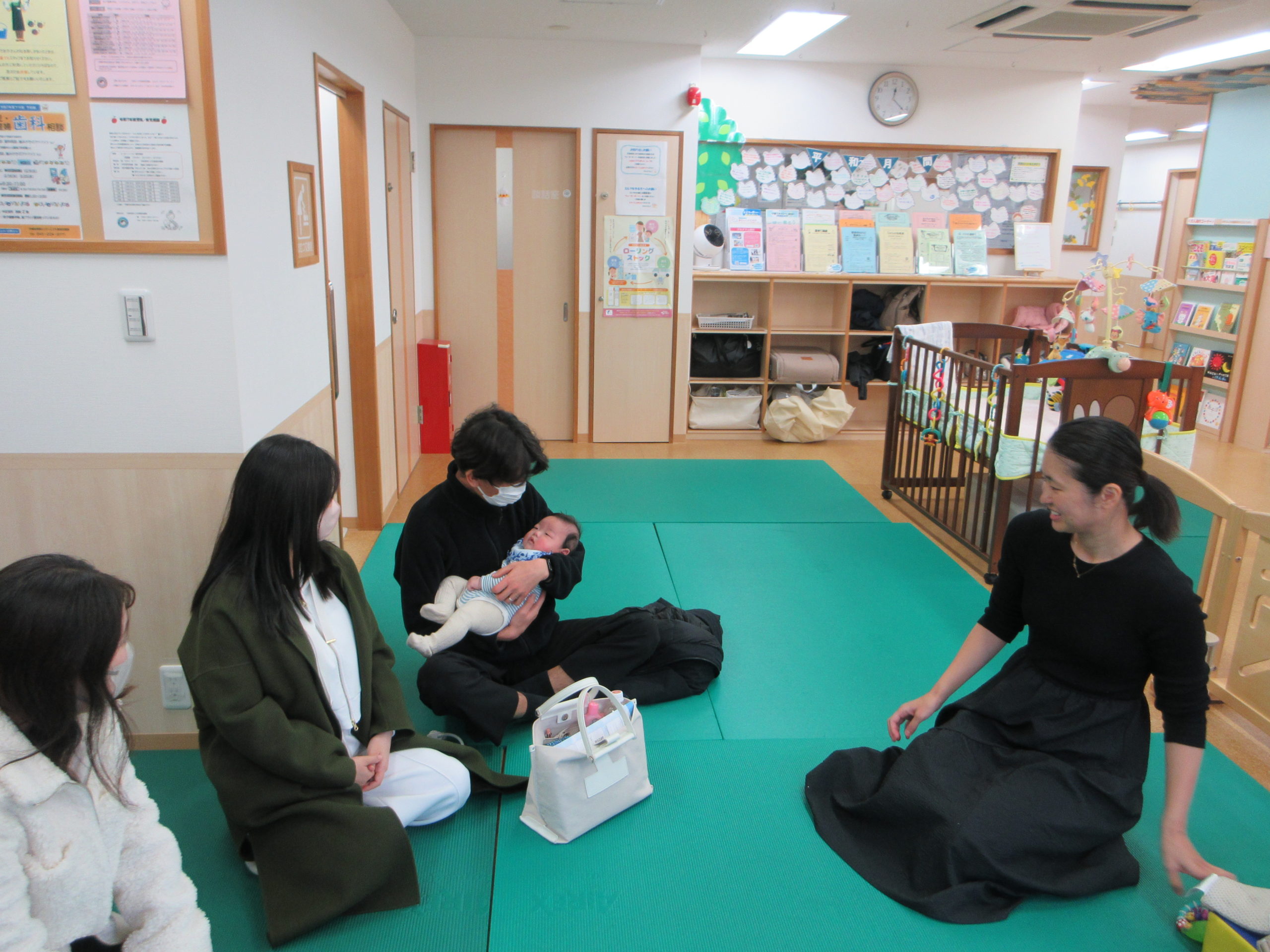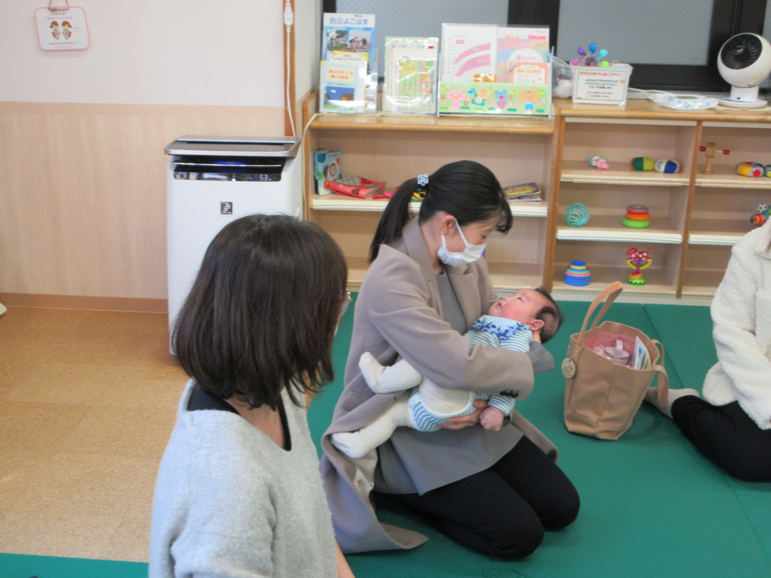 のんびりんこのひろばでは、先輩ママに質問したり3か月の赤ちゃんを抱っこさせてもらったりしました。