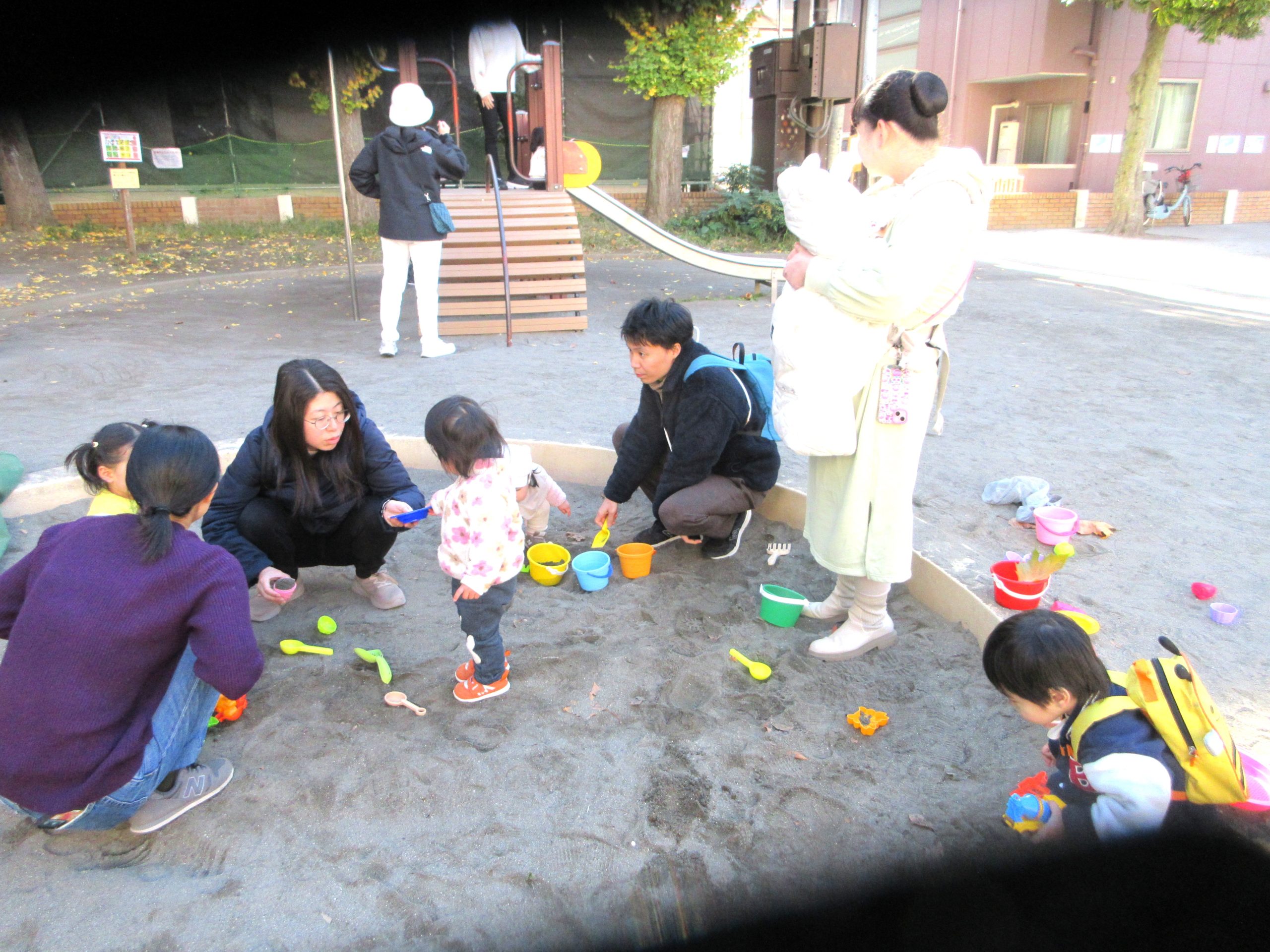 滑り台に夢中なおともだち、砂場やシャボン玉遊びなど、おもいおもいに遊びました。