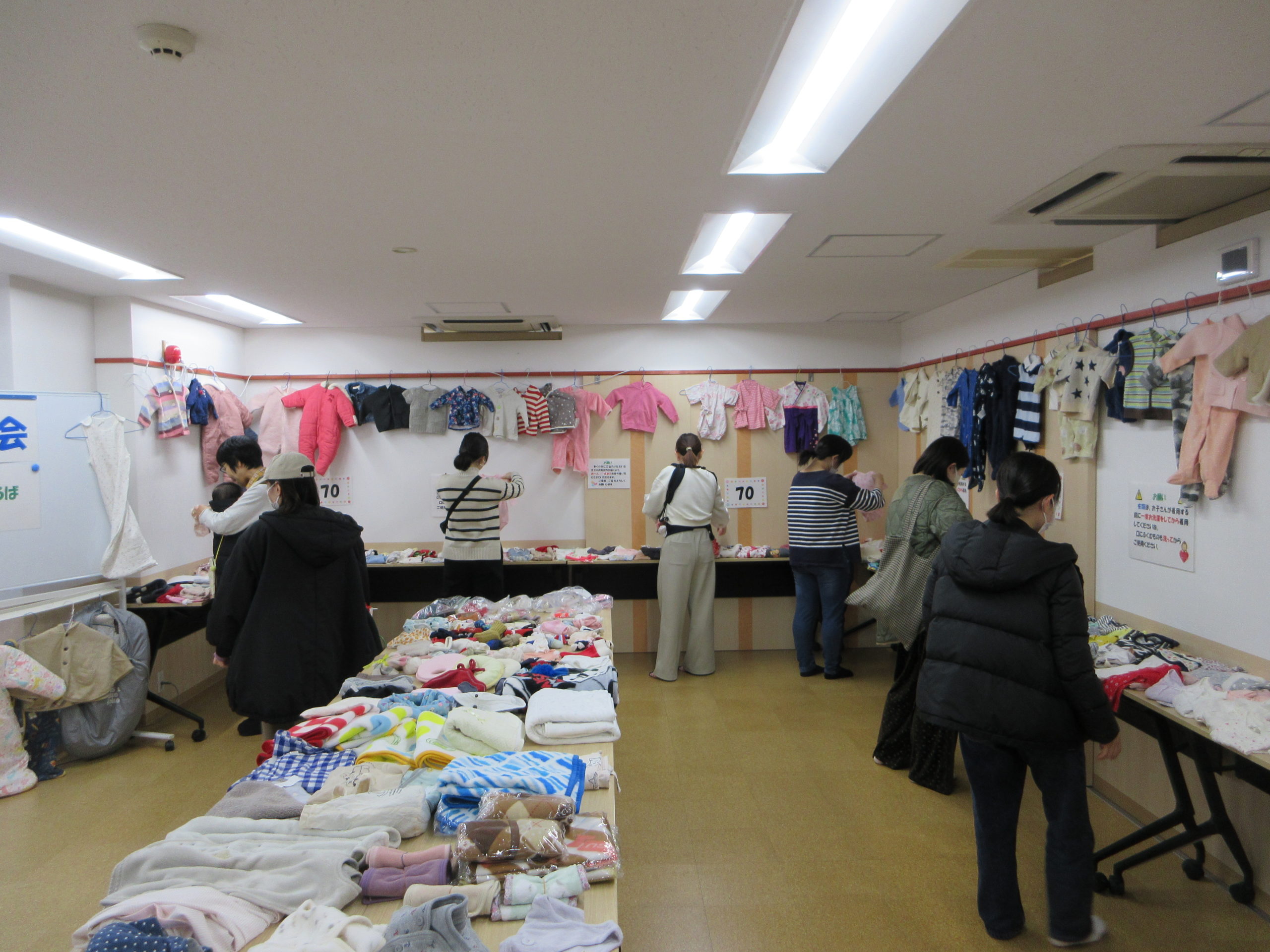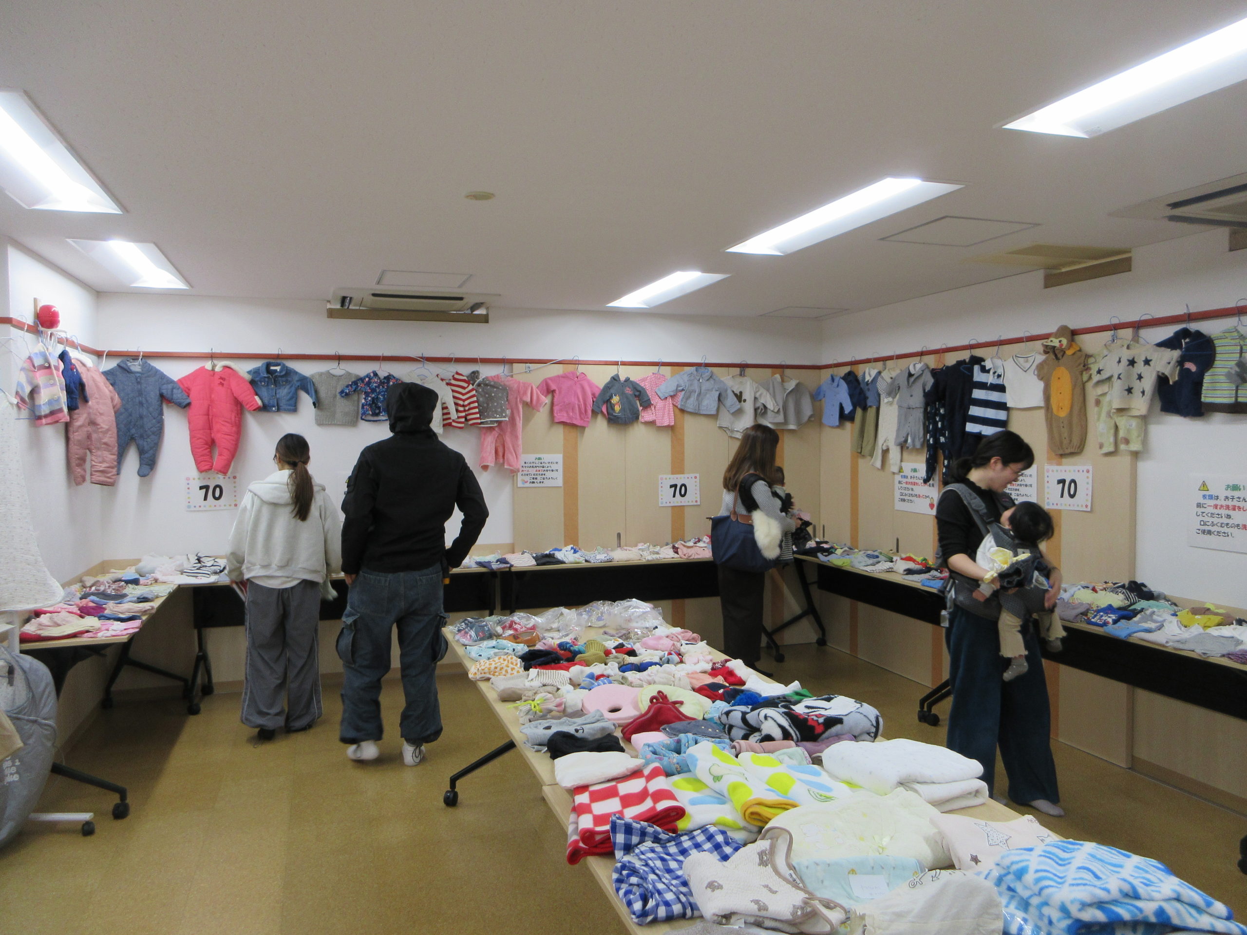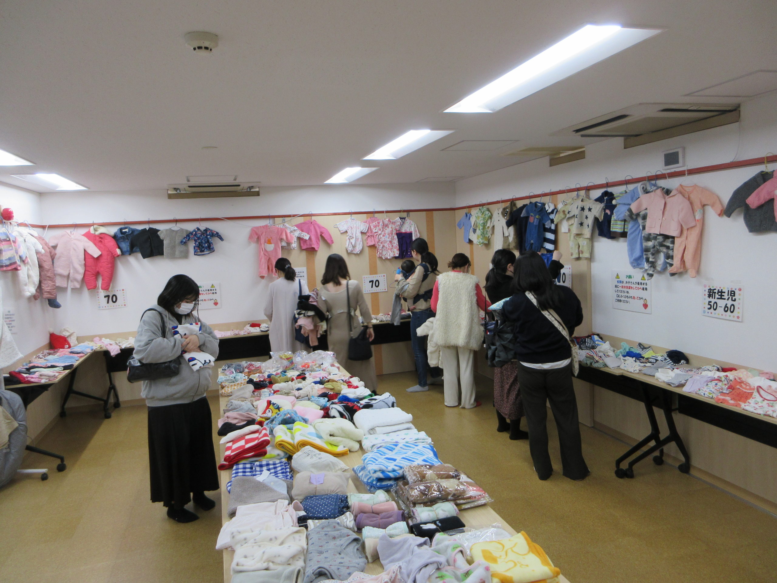 今日は新生児の50㎝サイズから70㎝までの衣類や子育て用品が並びました。