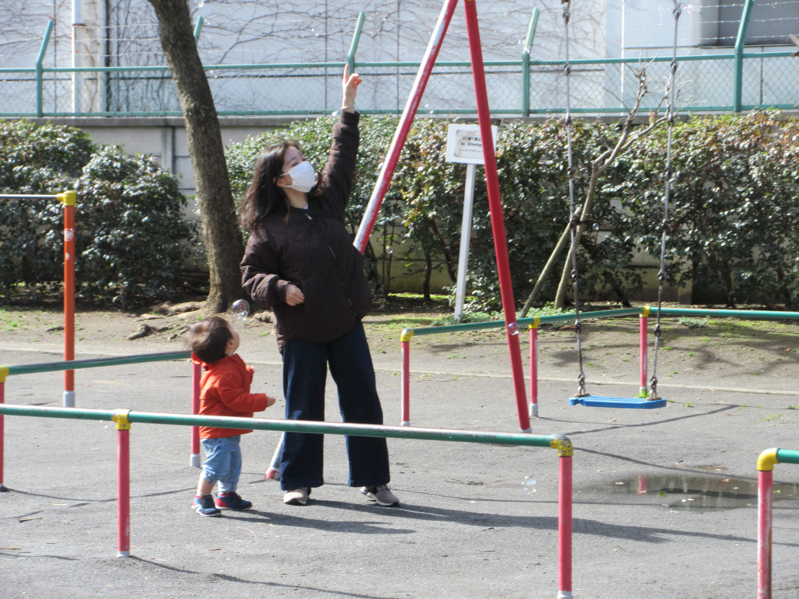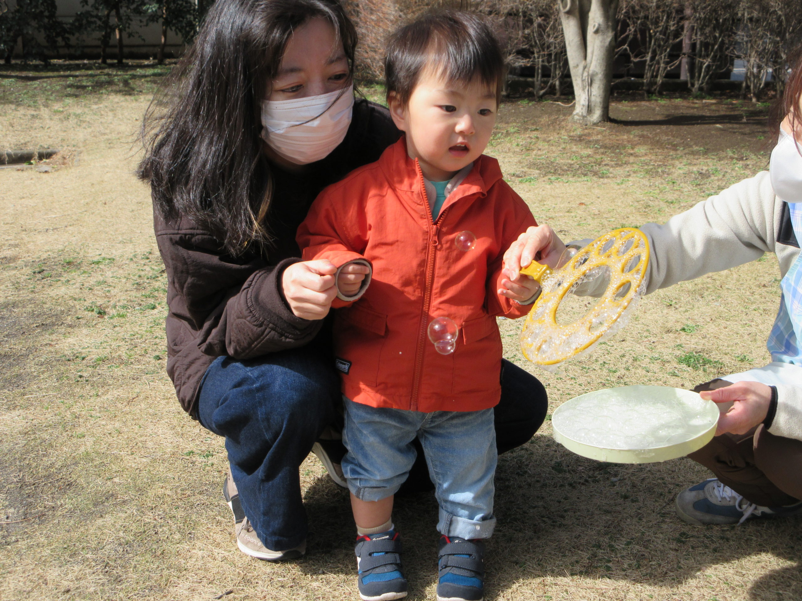 シャボン玉が楽しくて、近くの保育園のお友達もぐるぐる回って追いかけていました。