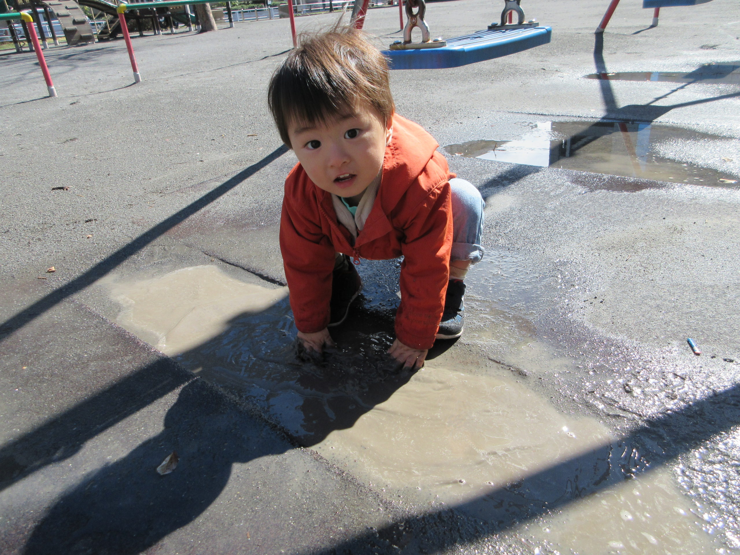 水たまりが楽しくて水たまりにぴちゃぴちゃ、足踏みしたり、手を入れたりと雨のおかげで楽しいことも増えました~。