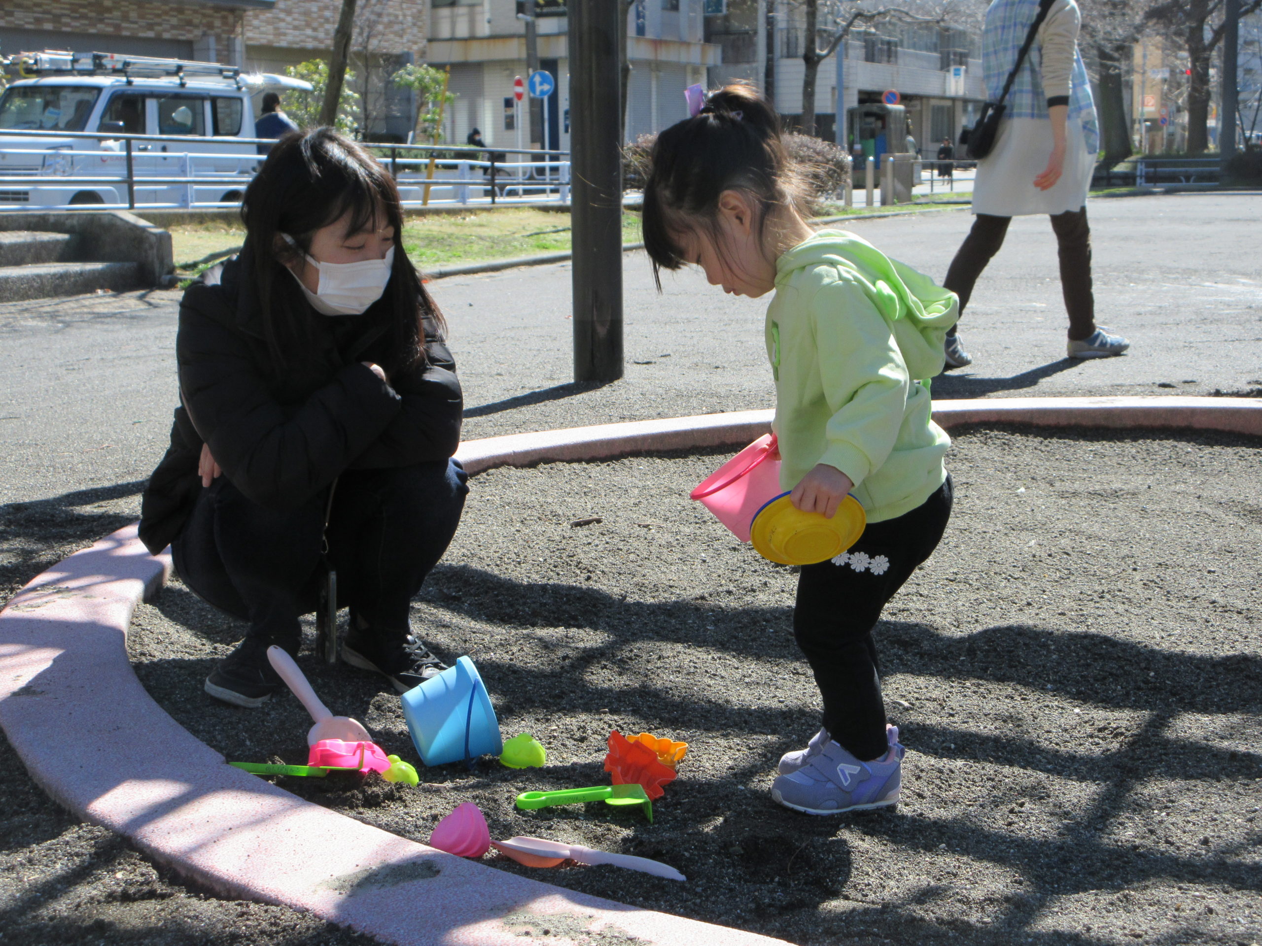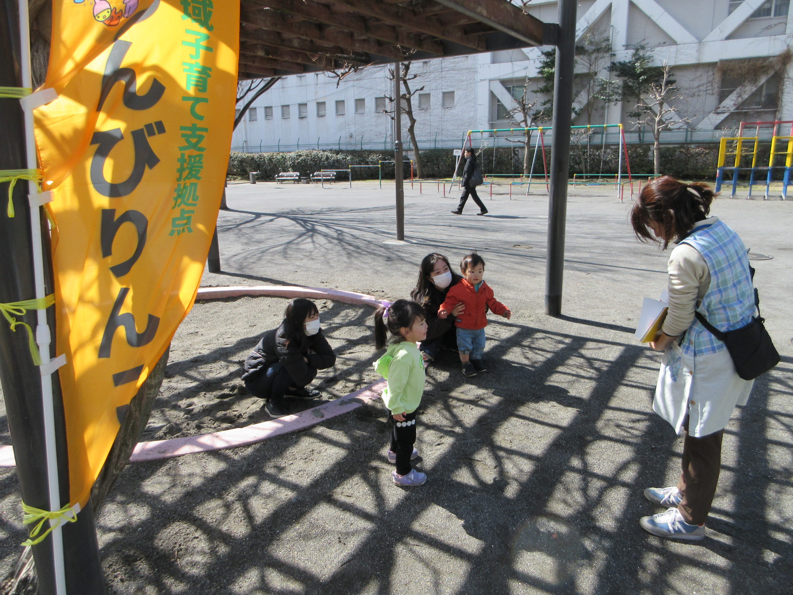 近くでは、おかめ桜が満開で、ピンクの花びらが風に舞う中、4組の親子が参加してくれました。