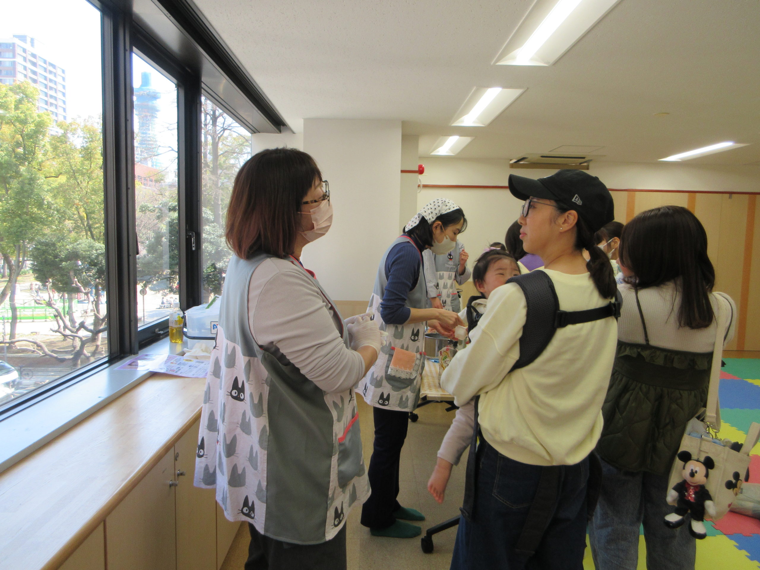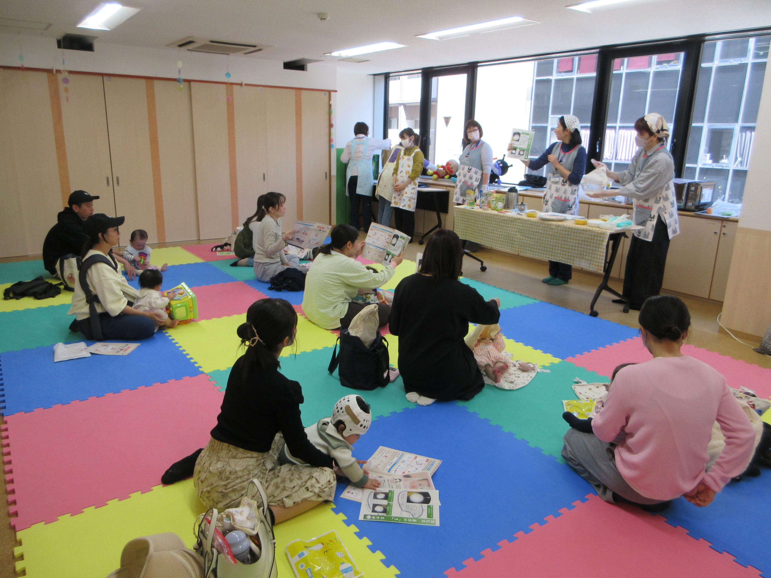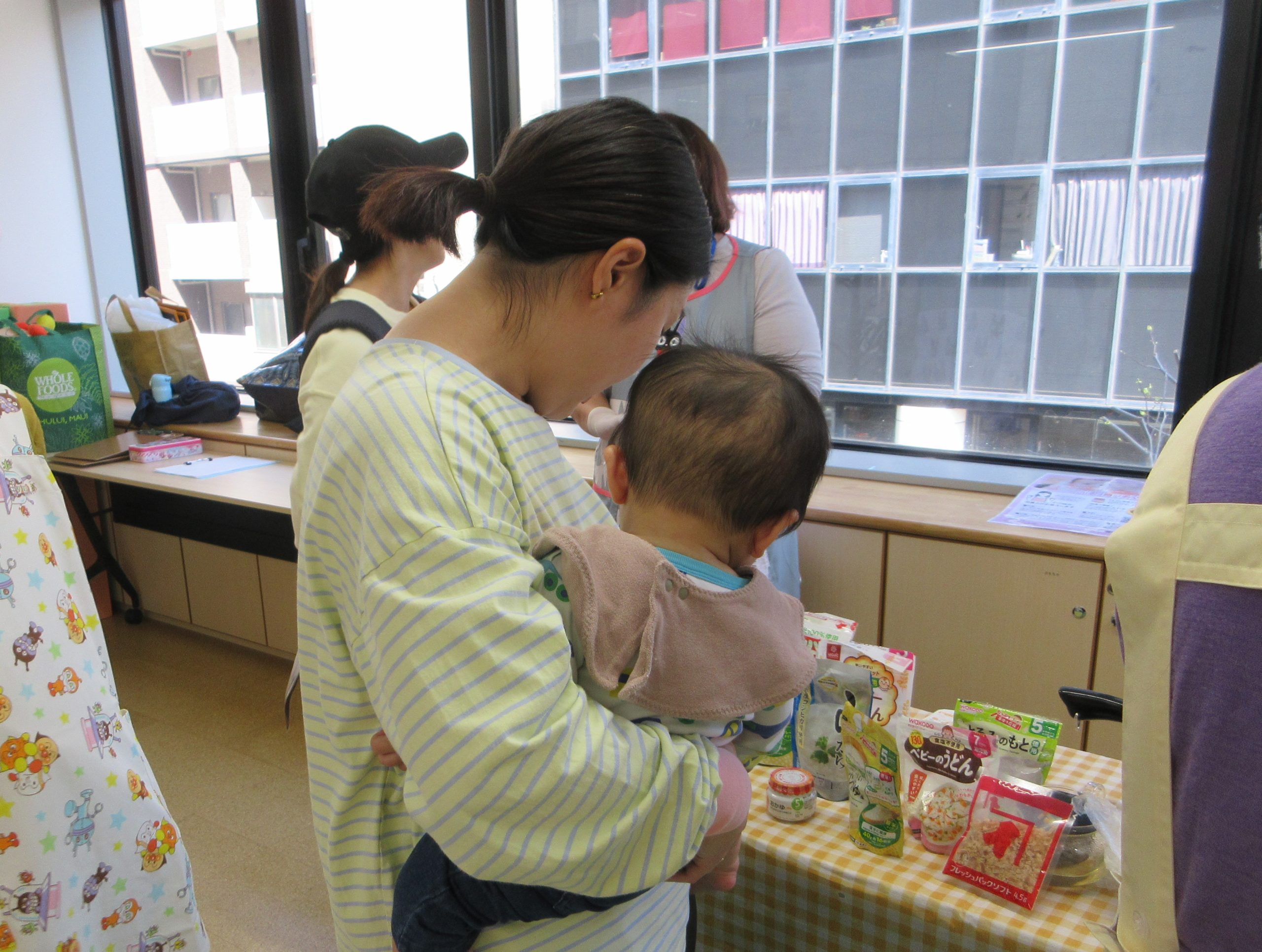 栄養士さんによる離乳食のおはなしでは、初期のおかゆやレンジをつかった野菜の加熱について教えていただきました。