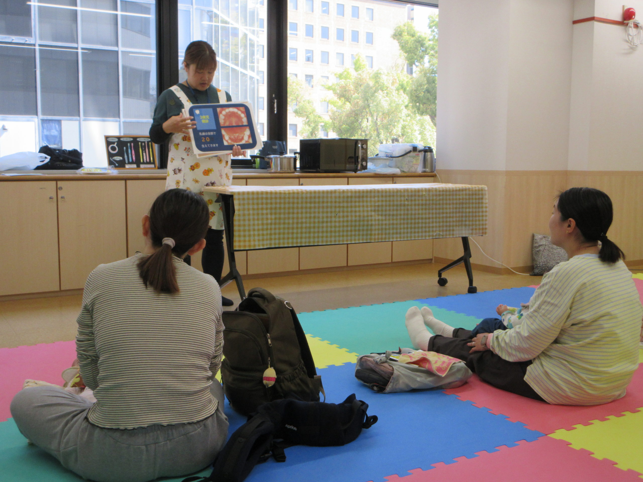 中区役所福祉保健課から歯科衛生士さんと栄養士さんが来館し、歯みがきのこと・離乳食のことについてお話していただきました。