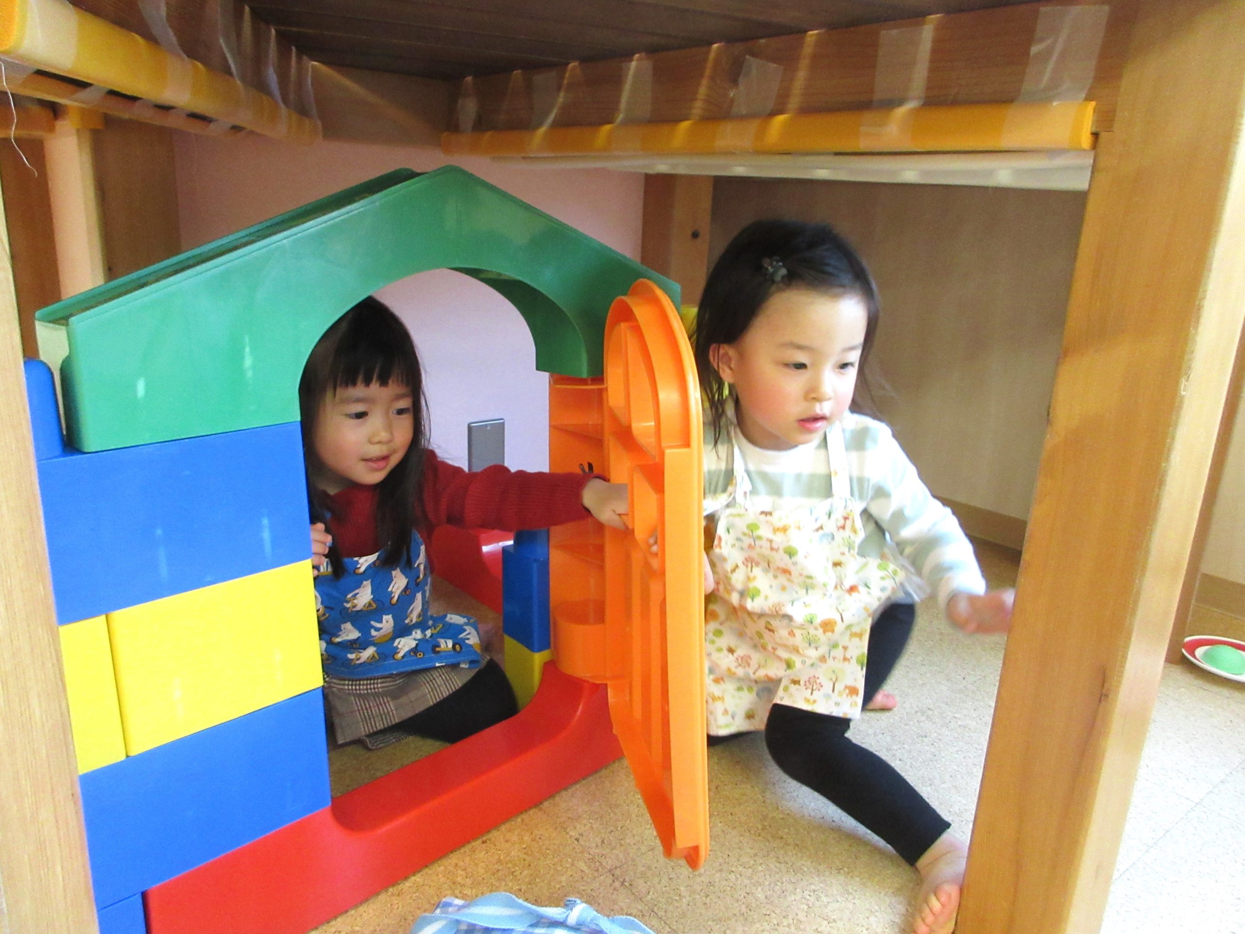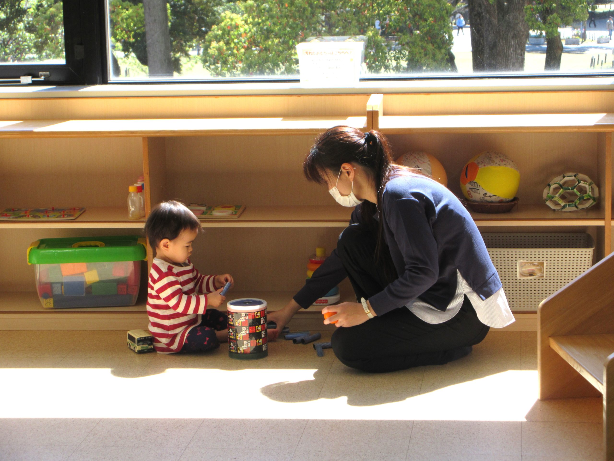 ポットン落としに集中するおともだち、線路をつないでおともだちと遊ぶおともだち、おままごとをママに見せてくれるおともだちなど、それぞれ思い思いの遊びを満喫してましたね。